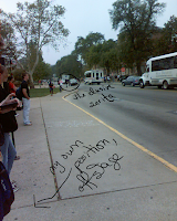ha! (^_^) well, it was 9.34 AM, so she was probably late to class, and she was bookin’ it down the street at such insane speeds that literally i did not even realize it was her until she was totally down the street (^^;) but there she is anyway. victory, or something like it.